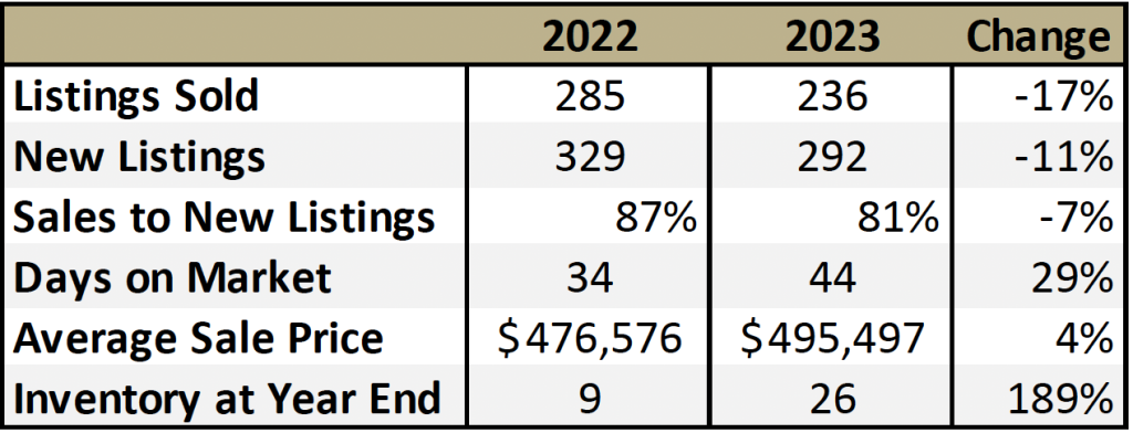 It’s that time of year! Time to have a look at how the Yellowknife real estate market performed in 2023. The short version is that 17% fewer homes sold through our local MLS in 2023 than the year prior, which is a decrease similar to many places in the country. But despite having a slower year, our average sale price still went up by 4%. Here is a table full of stats, and then we’ll get into the hows and whys of what took place.