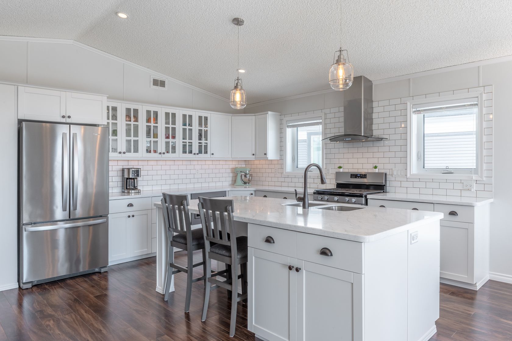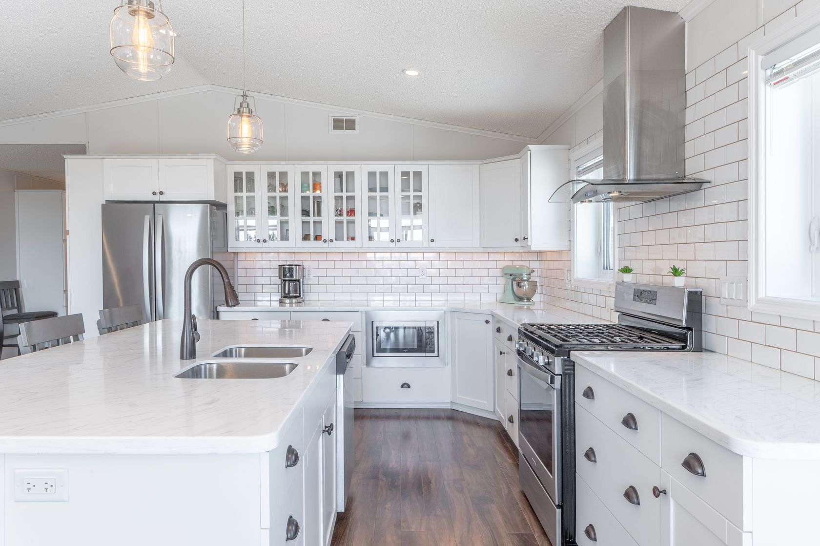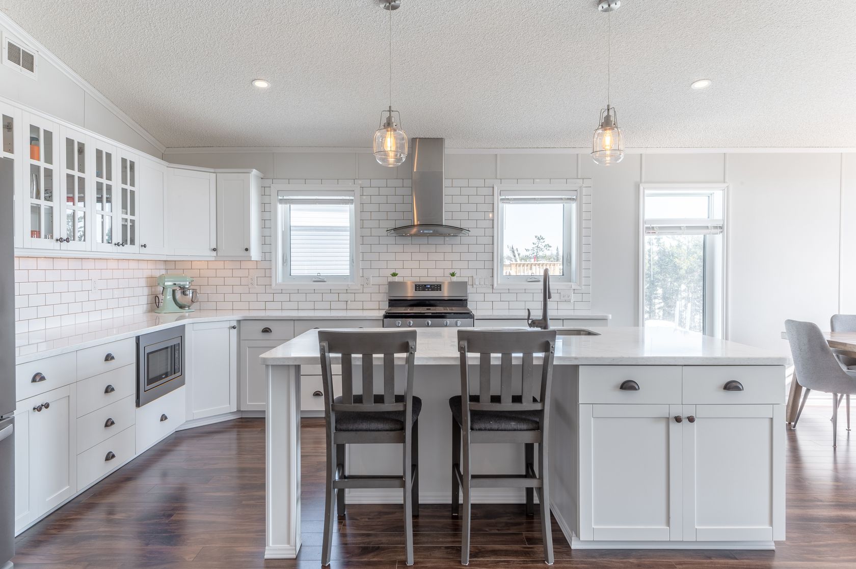 The large kitchen is the heart of this home, showcasing white, solid maple wood cabinetry, antique bronze cup pulls and white subway tiles with haystack grout, providing a clean and modern aesthetic. The kitchen tile extends up on either side of the range hood, creating a striking focal point. The kitchen appliances include a stainless steel french door fridge with a water dispenser, a gas range, a built-in microwave located in the lower cabinet, and a sleek euro range hood.