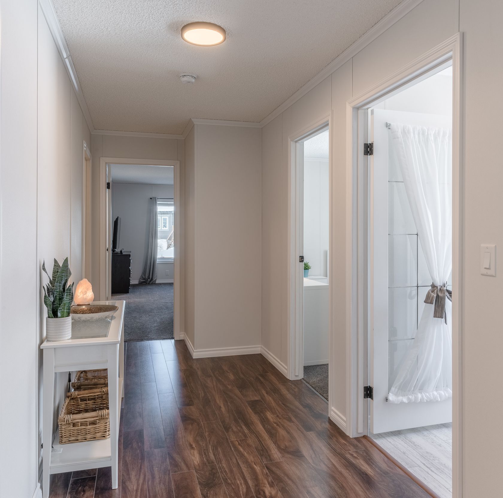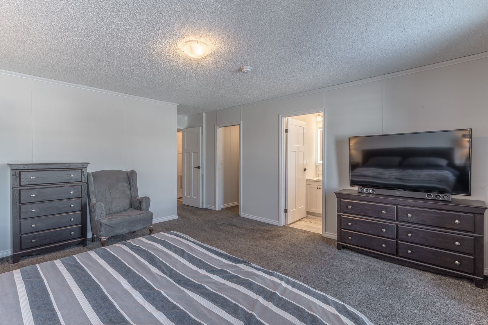 The large primary bedroom is a retreat in itself being generously sized, with a walk-in closet. The primary ensuite has been well thought out featuring a transom window above the oval tub for natural light while maintaining privacy and an LED-lit vanity mirror with tile extending to just above mirror height, adding a touch of luxury to your morning routine. The additional two bedrooms and main bath are well-sized, with additinal sound-dampening having been incorporated into the shared walls between the primary bedroom and adjacent bedroom.