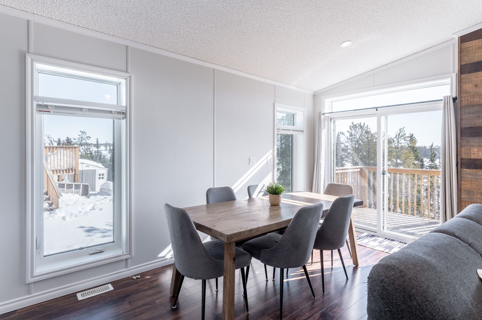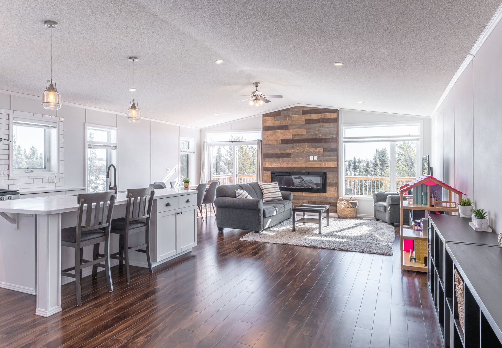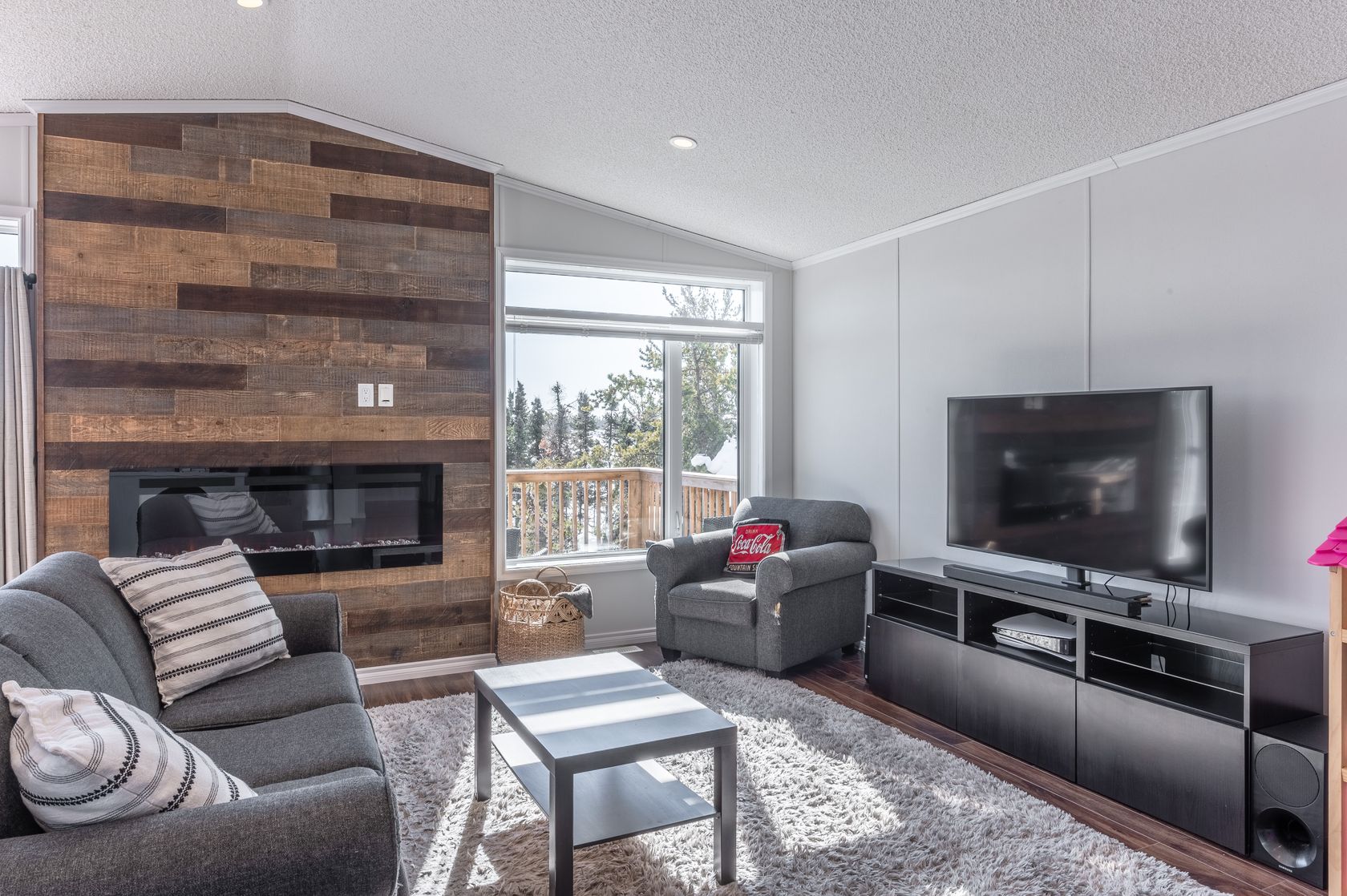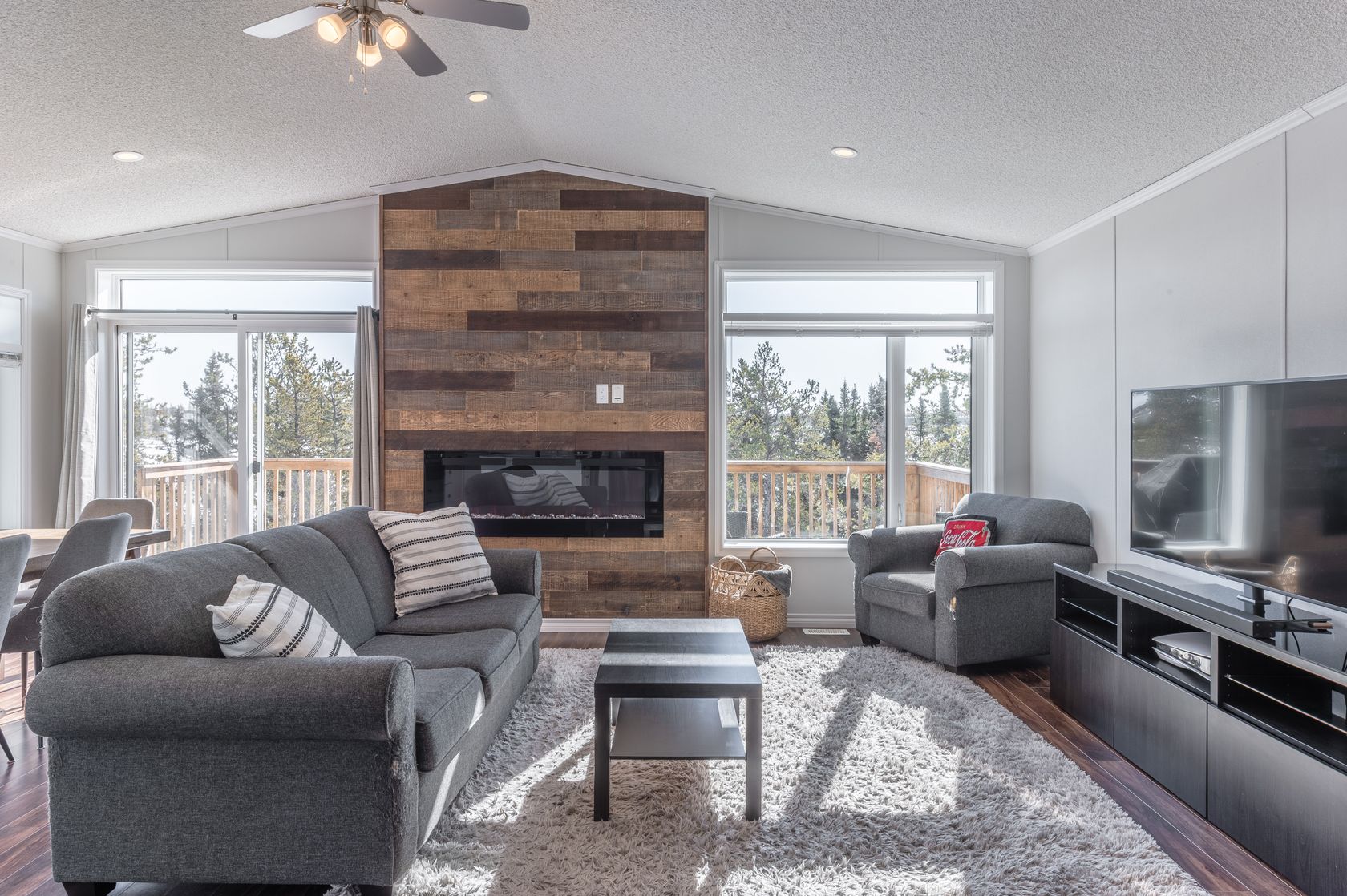 Relax and unwind in the living area, complete with a fireplace surrounded by wood feature wall adds rustic charm and creates a cozy atmosphere, with large windows on both sides for you to take in the waterfront views.