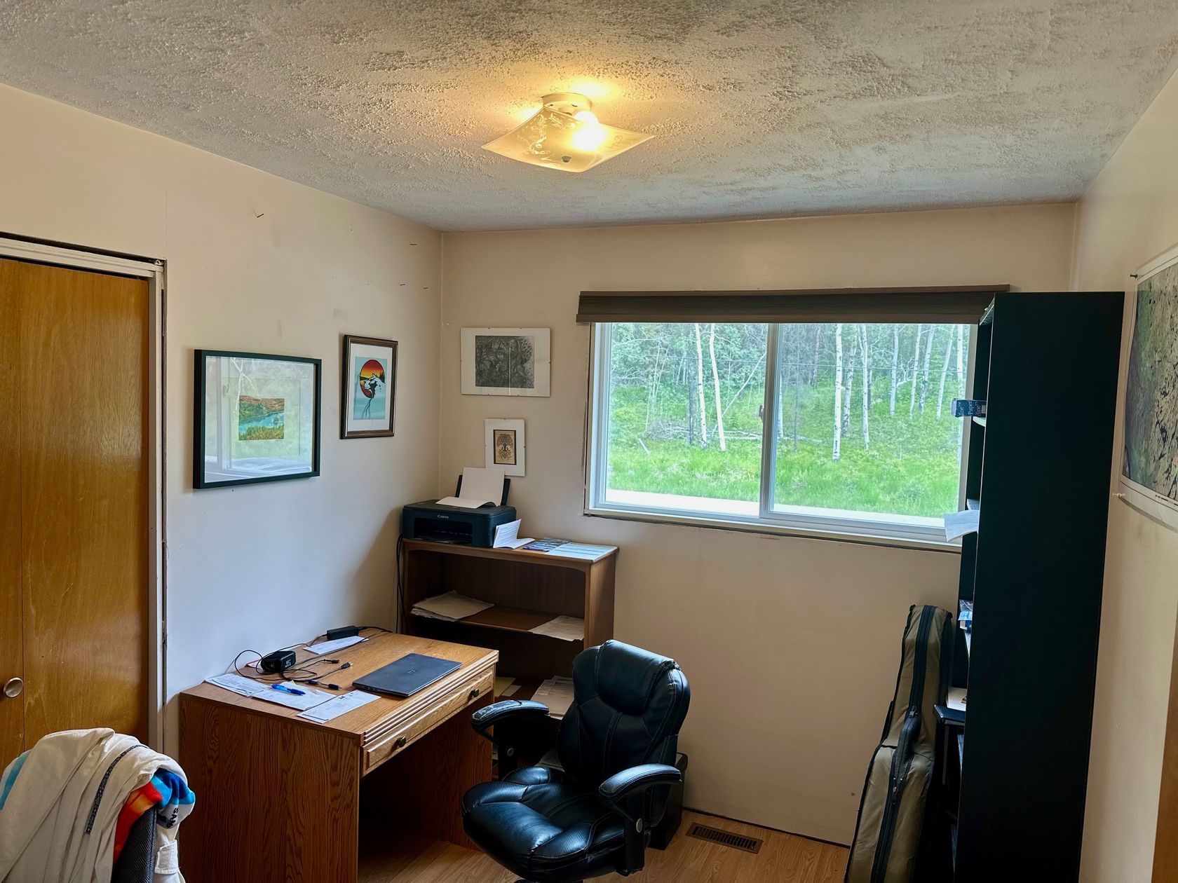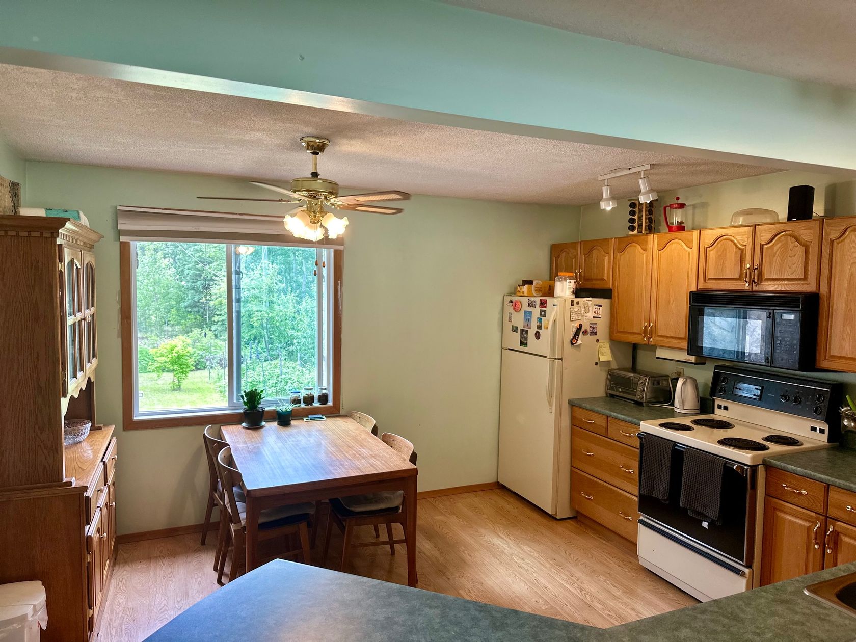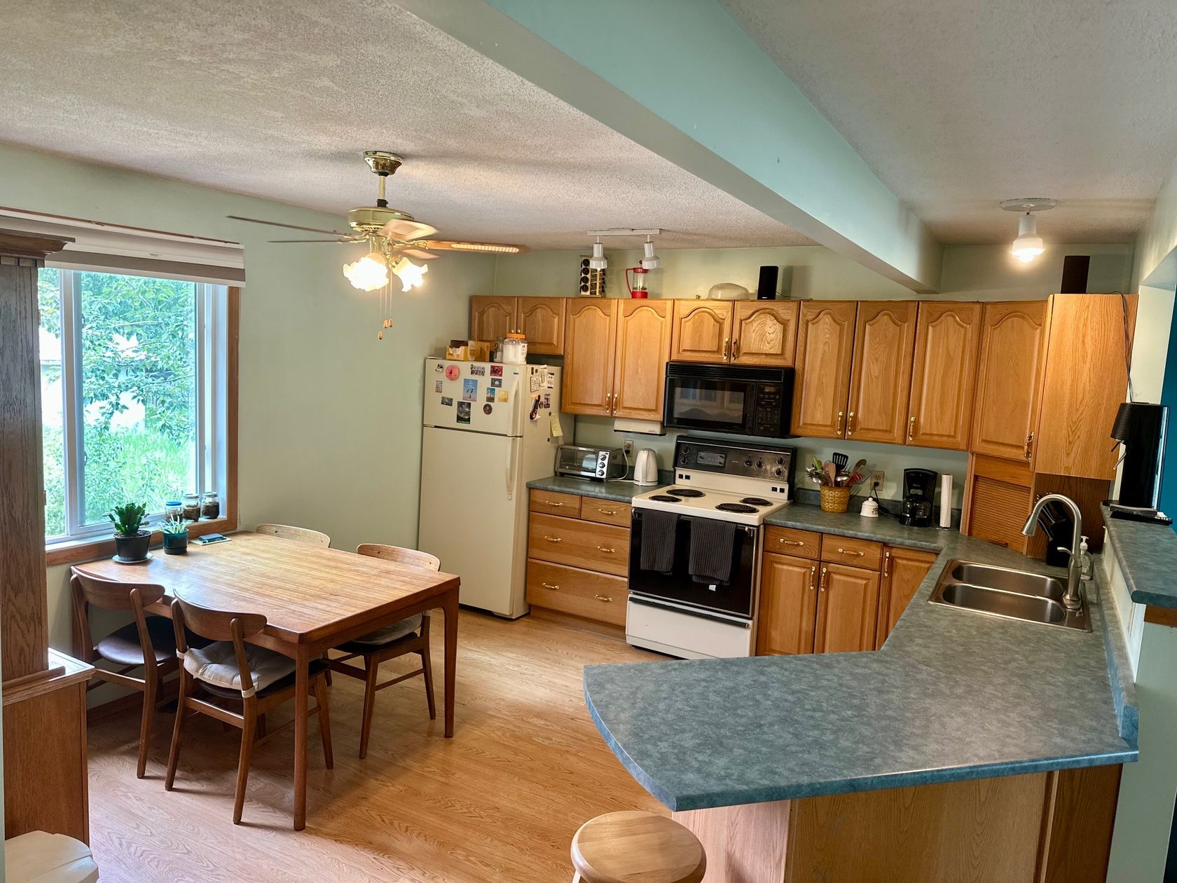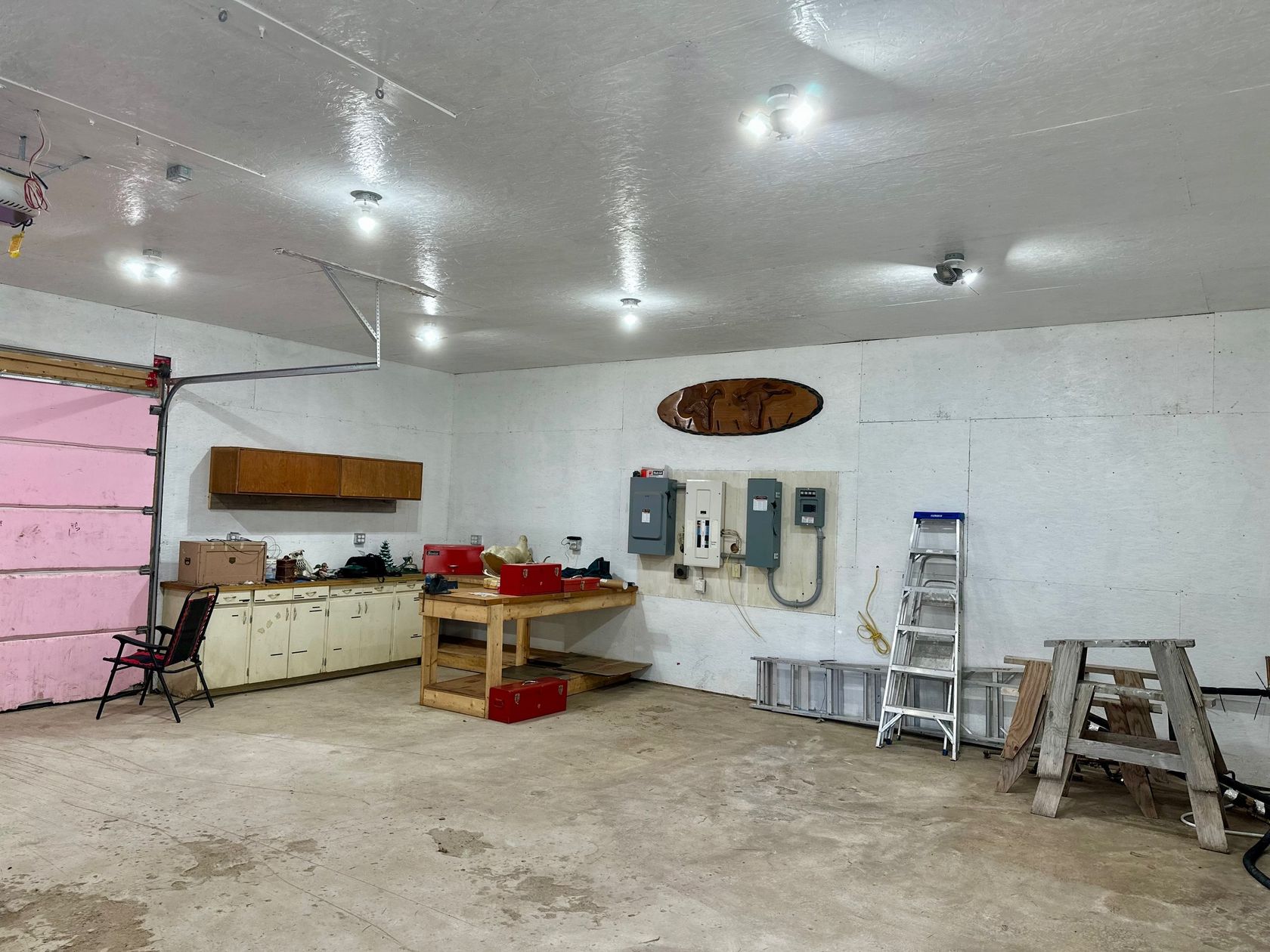 This home is located at the edge of town, with a private backyard oasis to enjoy! This home features five bedrooms, two bathrooms, and plenty of storage space. The garage has plenty of room with a workshop area, upgraded plug-ins, and plenty of space for parking your vehicle with an oversized garage door for taller trucks. There is a wood burning sauna in the back yard that can be used year-round. This home is a gardener's dream with a greenhouse off of the garage, a number of fruit bearing plants throughout the yard, and plenty of room to have a garden.
