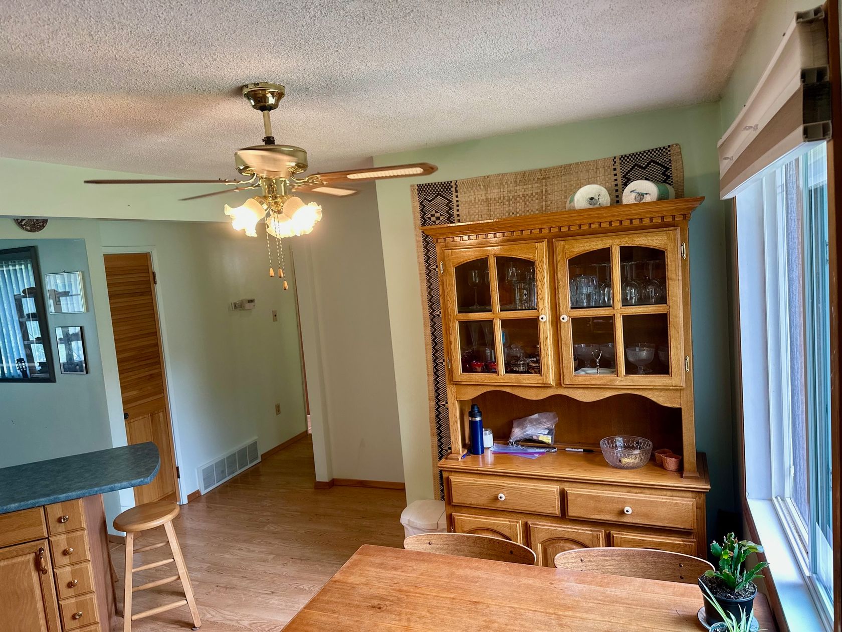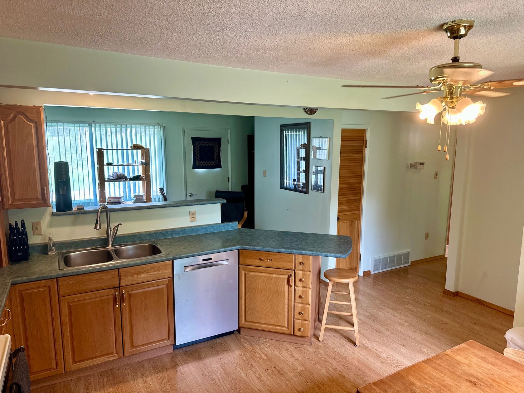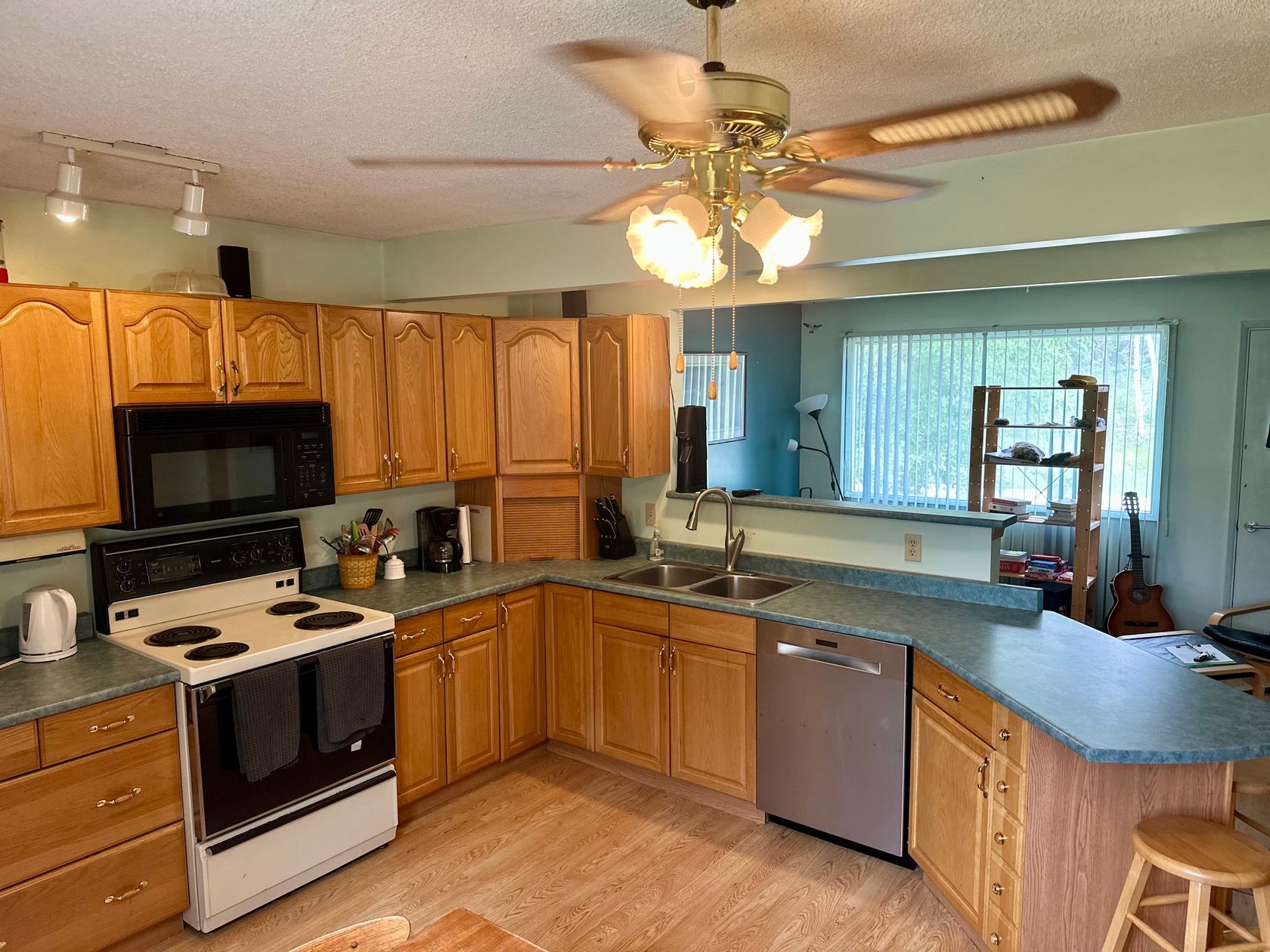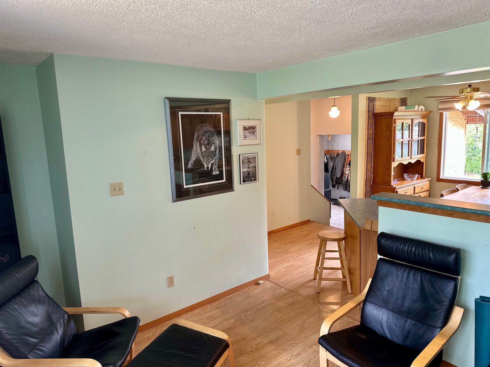 This home is located at the edge of town, with a private backyard oasis to enjoy! This home features five bedrooms, two bathrooms, and plenty of storage space. The garage has plenty of room with a workshop area, upgraded plug-ins, and plenty of space for parking your vehicle with an oversized garage door for taller trucks. There is a wood burning sauna in the back yard that can be used year-round. This home is a gardener's dream with a greenhouse off of the garage, a number of fruit bearing plants throughout the yard, and plenty of room to have a garden.