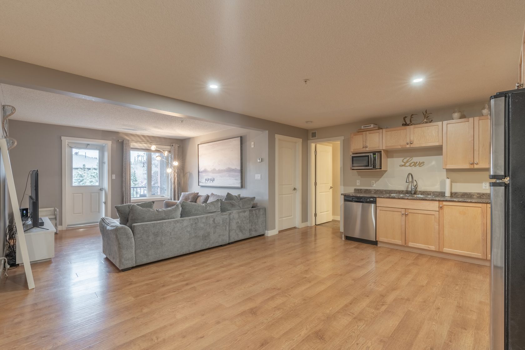 Step inside to find an inviting open-concept layout filled with warm evening light. The space is enhanced by upgraded laminate flooring, light maple shaker cabinetry, and stainless steel Whirlpool appliances — all combining to create a bright and modern atmosphere that feels like home the moment you walk in.