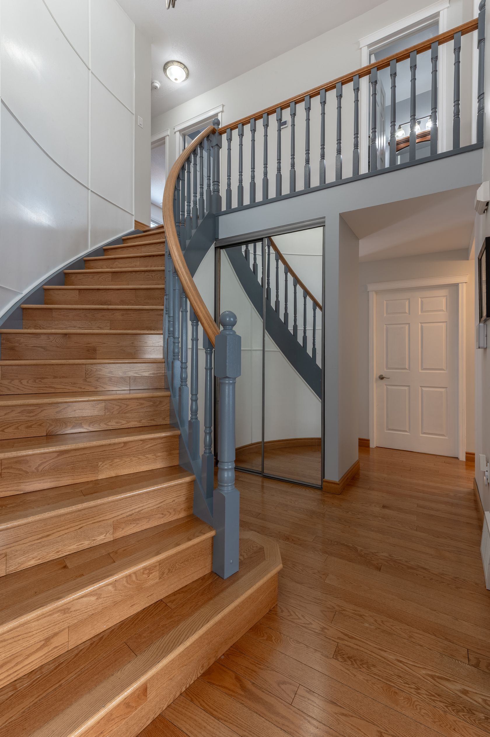 Step inside to a thoughtfully designed closed entryway complete with coat hooks and a built-in storage bench—ideal for keeping everyday life organized. As you move into the main living space, you’re greeted by a grand foyer highlighted by a stunning curved staircase, rich hardwood finishes, and elegant paneled wall.