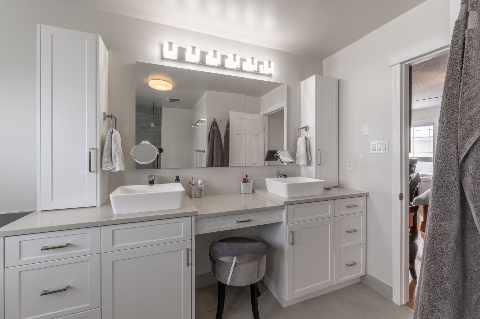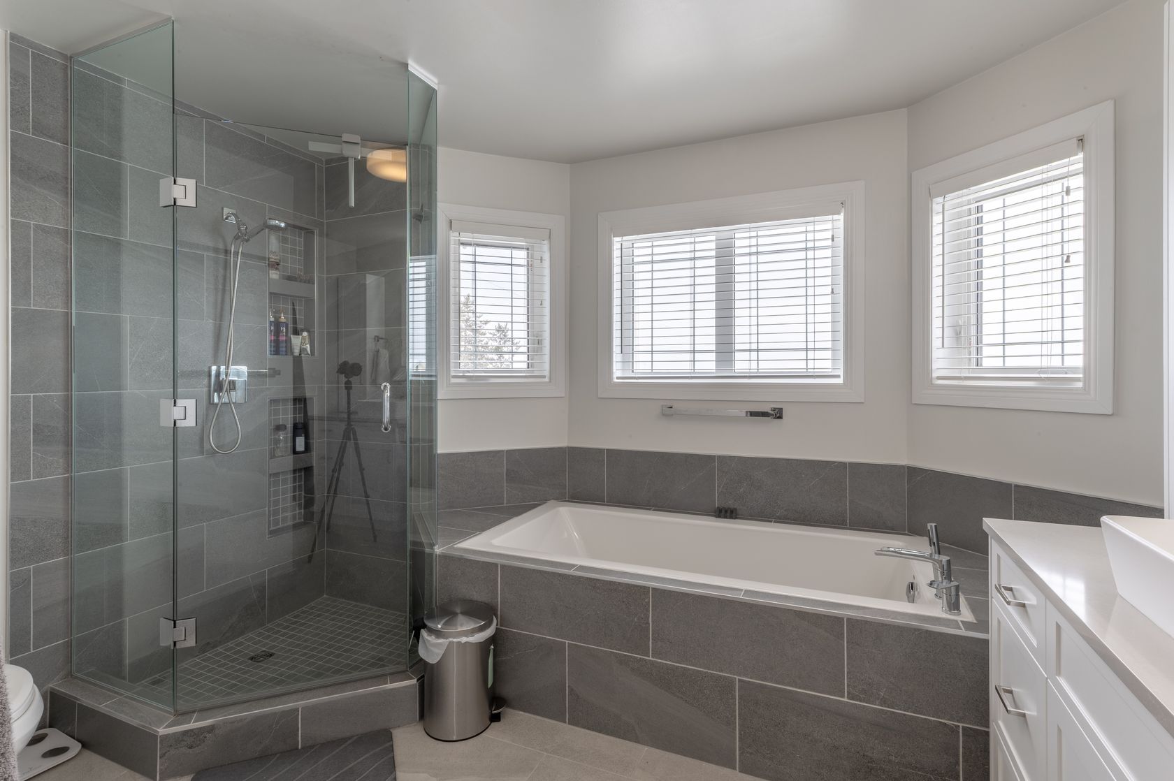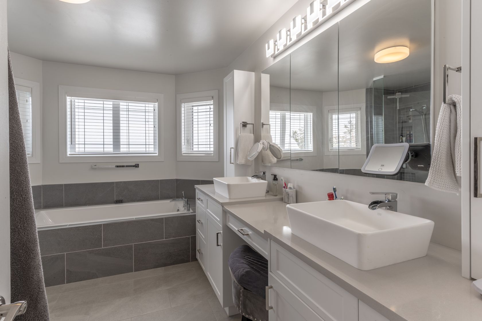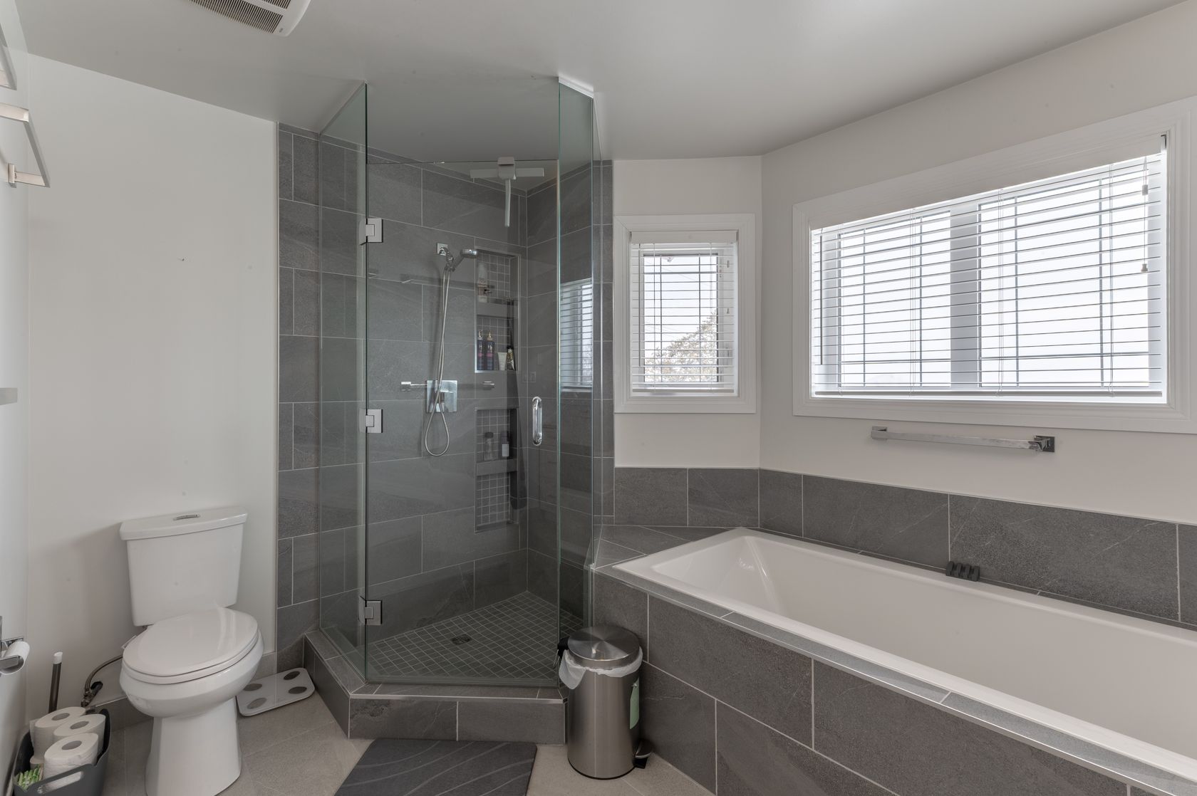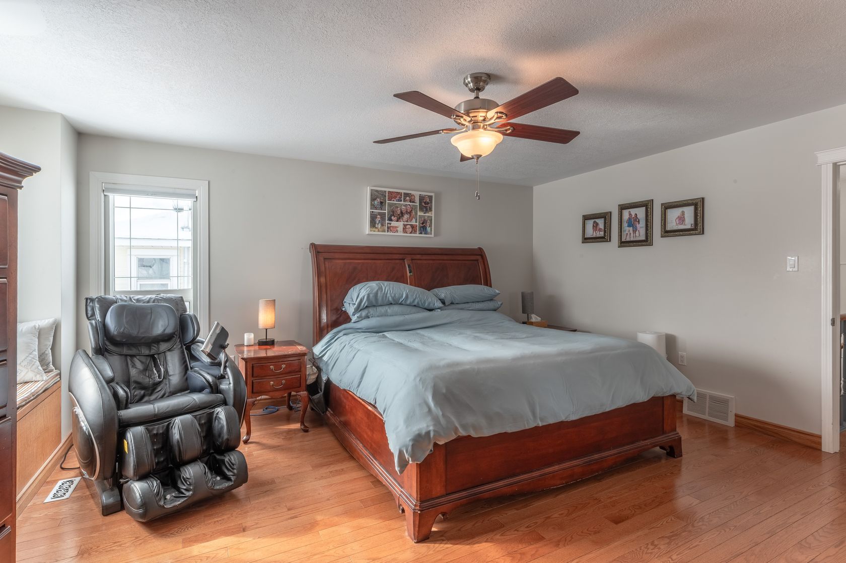Upstairs, you’ll appreciate having all four bedrooms on one level—a rare and highly desirable feature. The primary suite is a true retreat, complete with a walk-in closet featuring custom oak cabinetry and a beautifully renovated ensuite. This spa-like ensuite showcases bright white cabinetry, a soaker tub, glass shower, and sleek modern tile finishes. A full main bathroom completes the upper level.