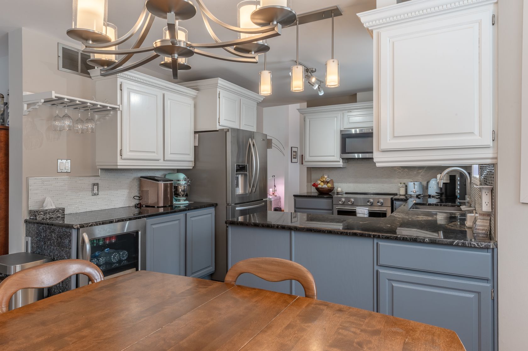 The main living room boasts vaulted ceilings and large updated windows that flood the space with natural light. Flowing seamlessly into the dining area and kitchen, this layout is perfect for both entertaining and everyday living. The kitchen features granite countertops, stainless steel appliances, and a truly charming hidden pantry designed to maximize every inch of space—plus an additional walk-in pantry/storage room is around the corner for even more convenience.