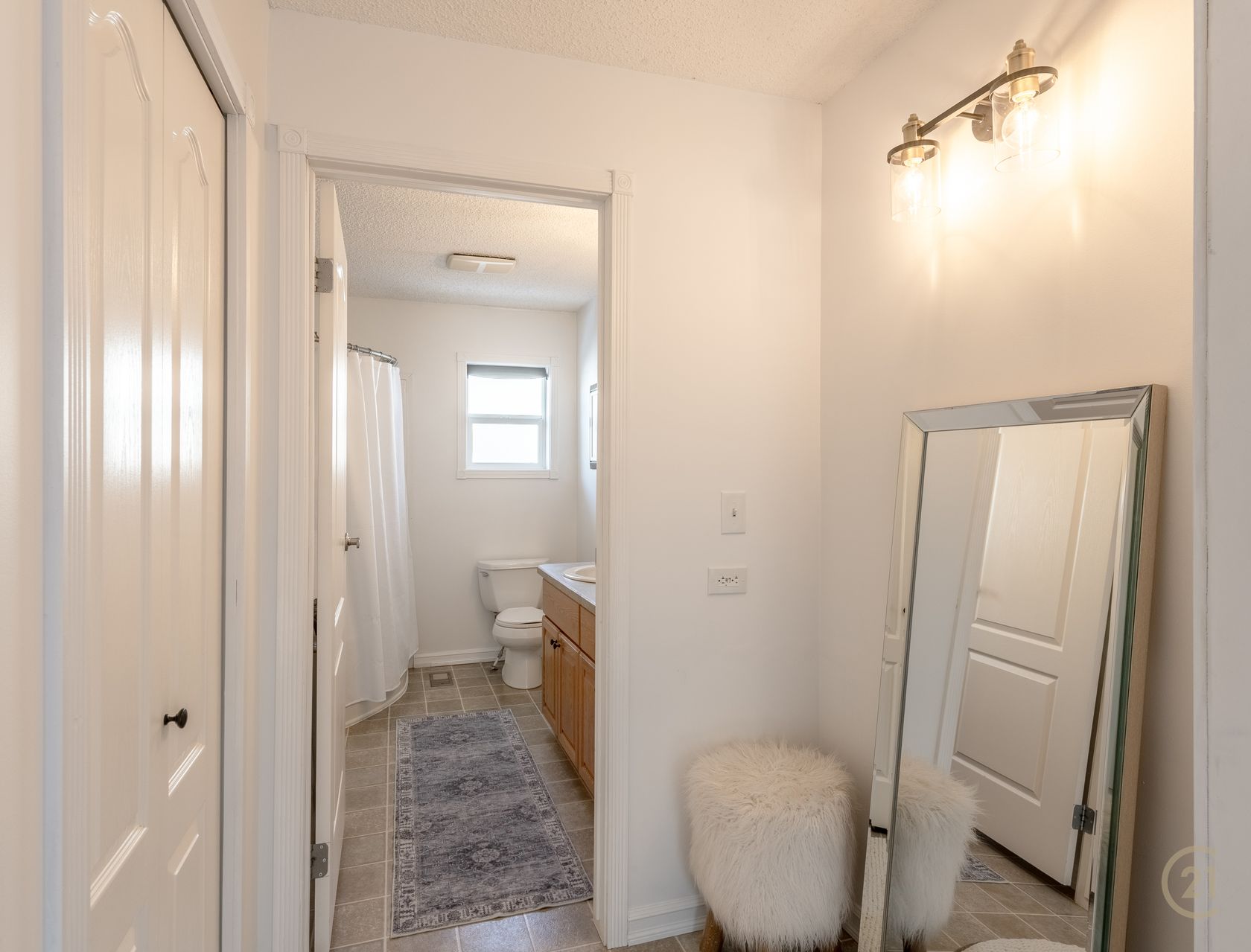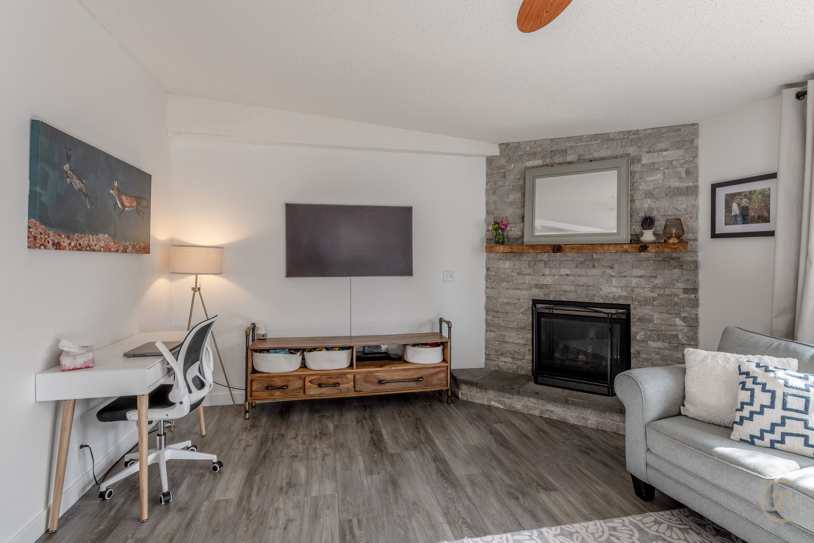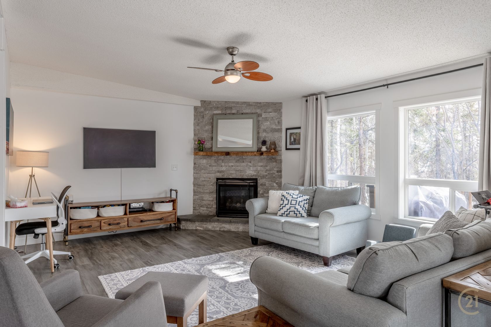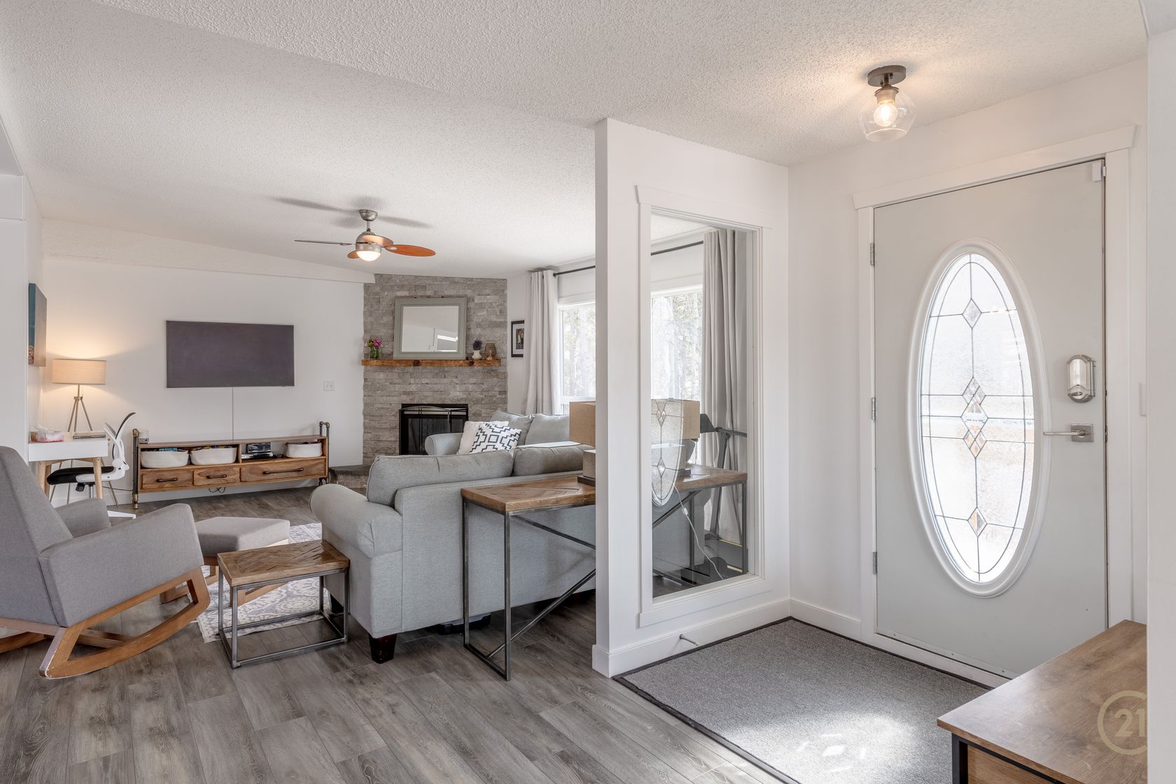 Inside, the main living area is filled with natural light, highlighted by large windows, updated flooring, and fresh paint throughout. The atmosphere is warm, open, and welcoming from the moment you step in.