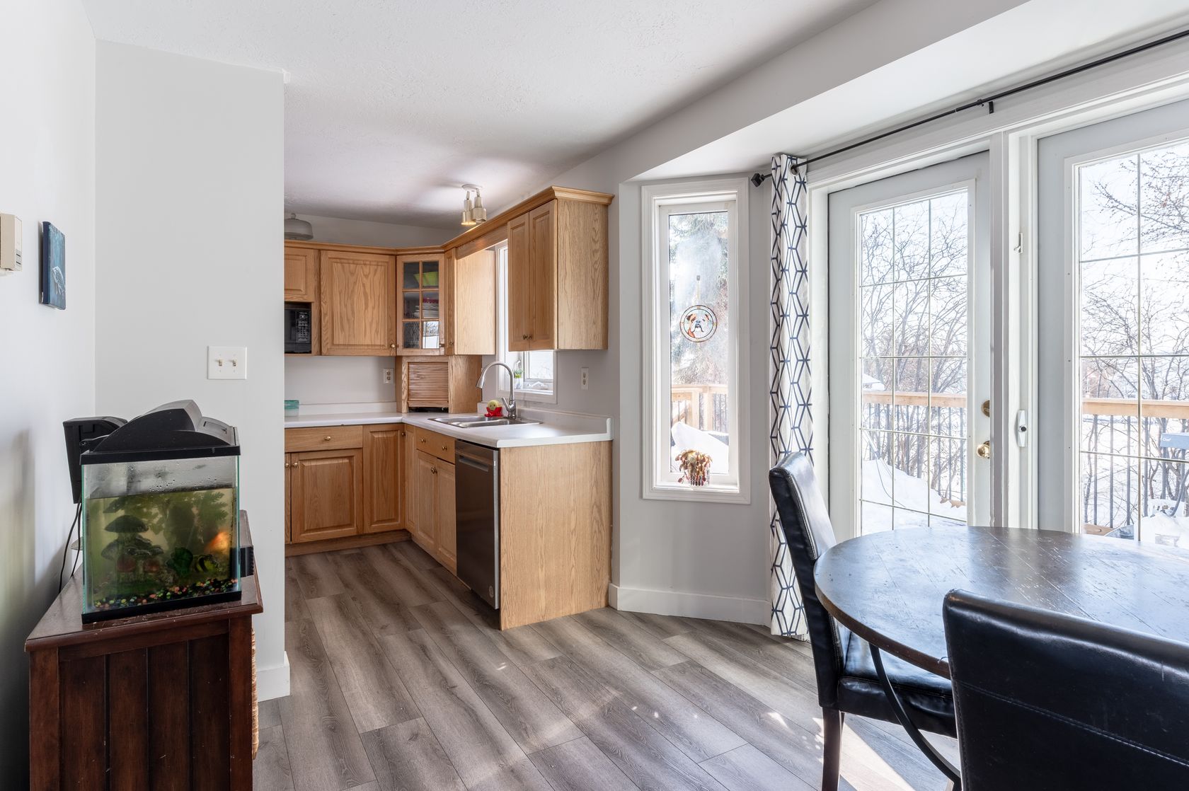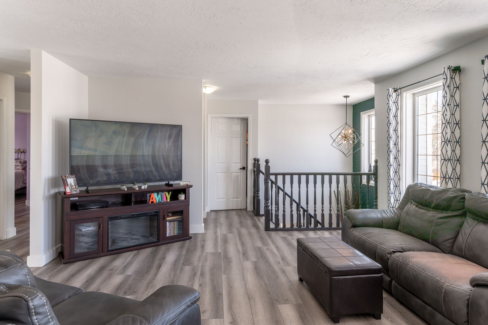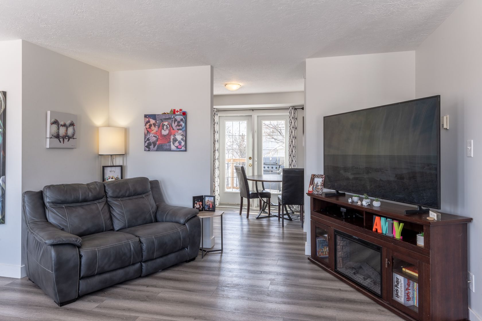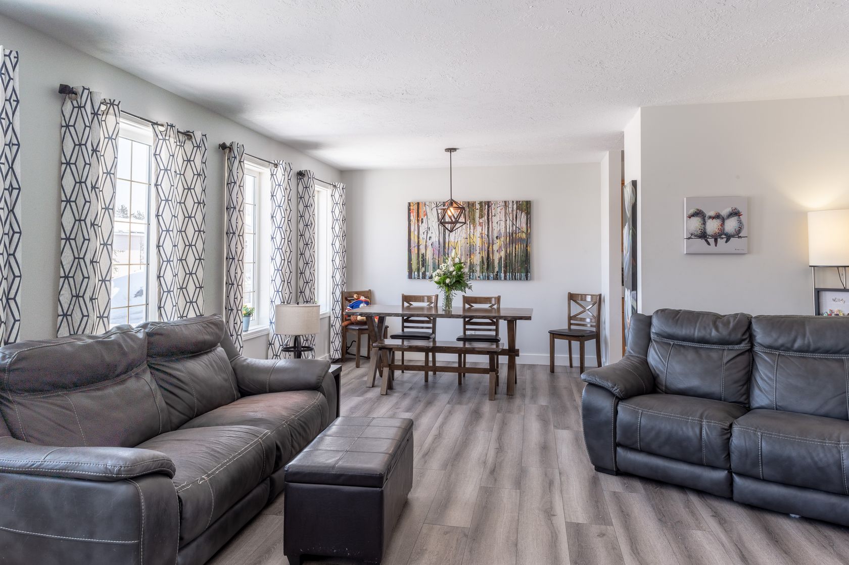 Upstairs, the home is bright and inviting, with large windows allowing natural light to pour into the main living spaces. The upper level features three bedrooms and two bathrooms, including the primary bedroom, complete with its own 3-piece ensuite. The layout offers comfortable everyday living with great flow between the kitchen, dining, and living areas.