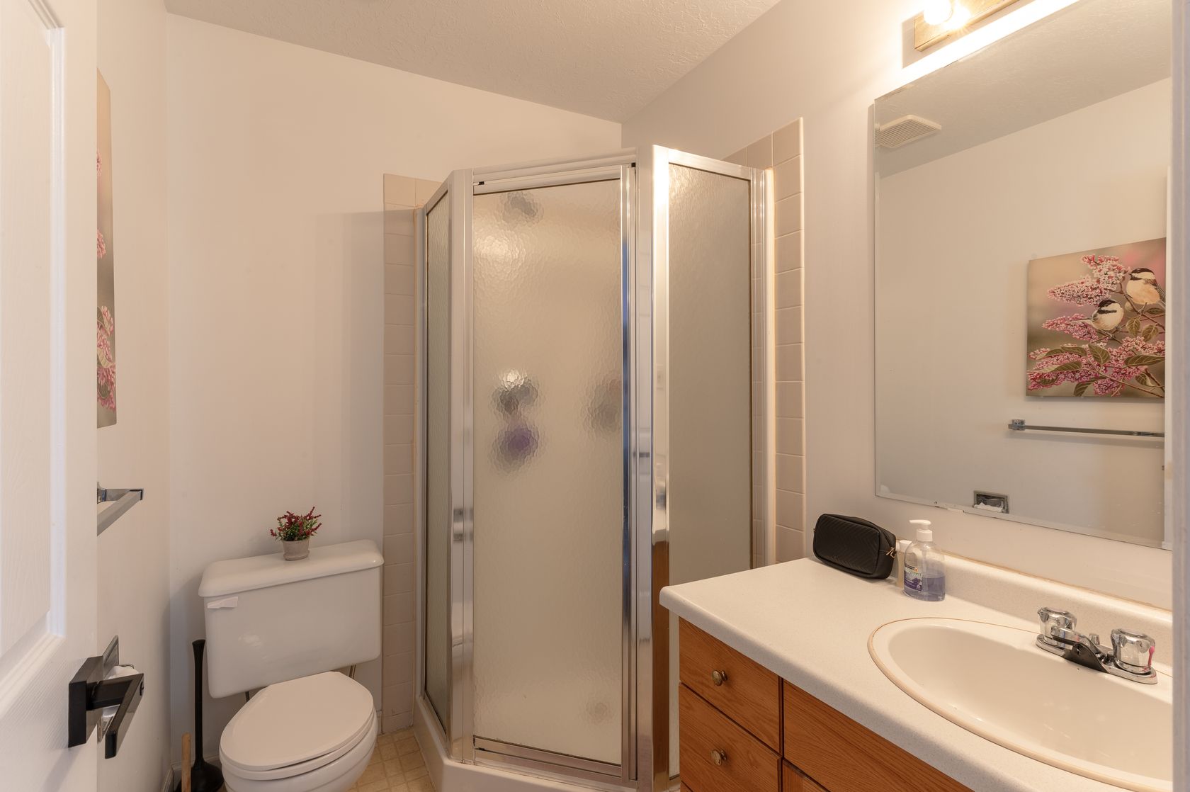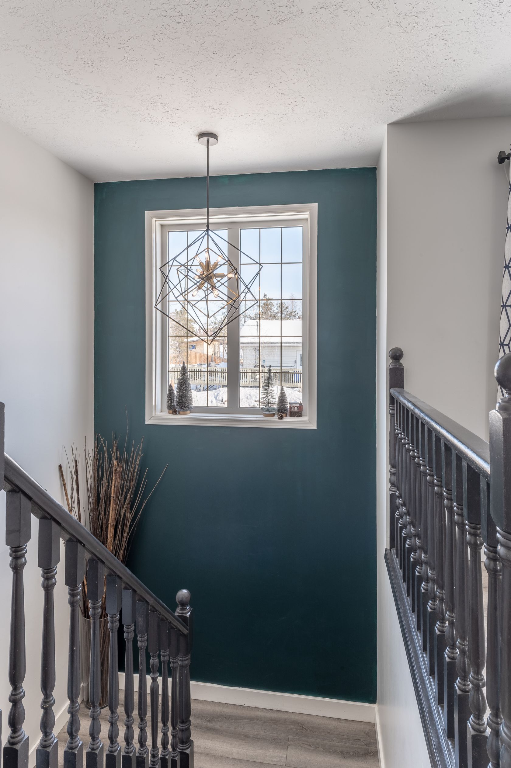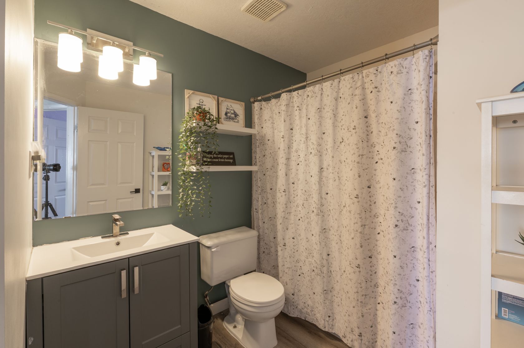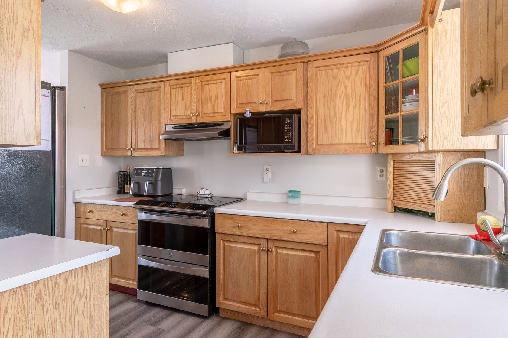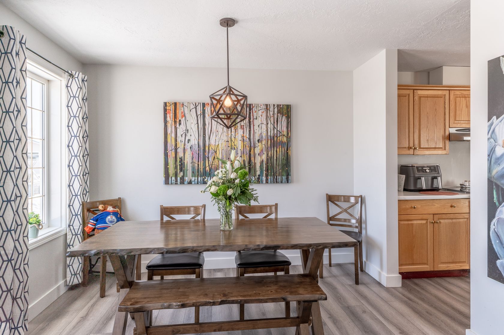 Upstairs, the home is bright and inviting, with large windows allowing natural light to pour into the main living spaces. The upper level features three bedrooms and two bathrooms, including the primary bedroom, complete with its own 3-piece ensuite. The layout offers comfortable everyday living with great flow between the kitchen, dining, and living areas.